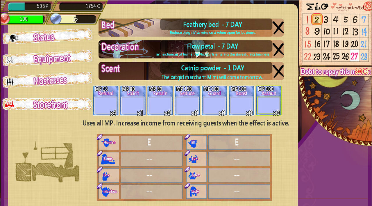 正常模式:每月要支付一笔债务。如果转世者的妓院继续吸引你的顾客,楼院就有关闭的危险。) _; o8 q/ B; G7 r